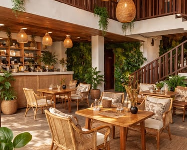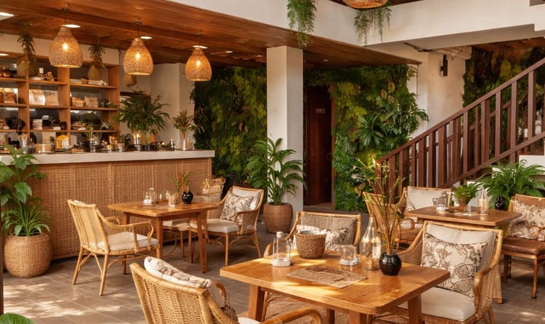 Snapshots of Bhuvana’s cozy hotel, vibrant café, and elegant restaurant.